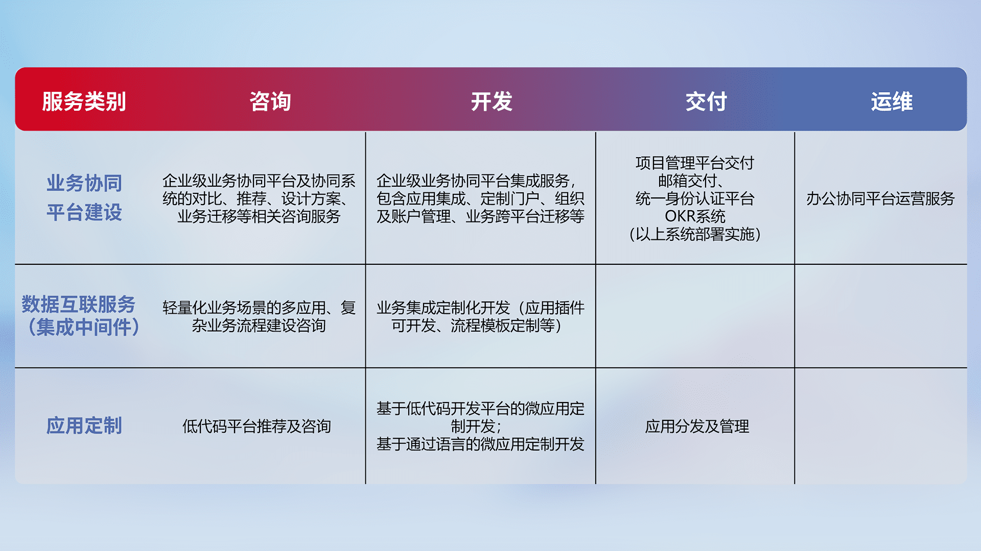 针对钉钉、、企微、、、、IDaas等平台级产品提供产品的规划、、方案、、、交付、、、定制化开发等服务,,,实现如统一协同办公、、智能客户服务、、、混合会议管理、、、、智能数据查询、、、、等业务场景,,,,实现数字化转型。。。