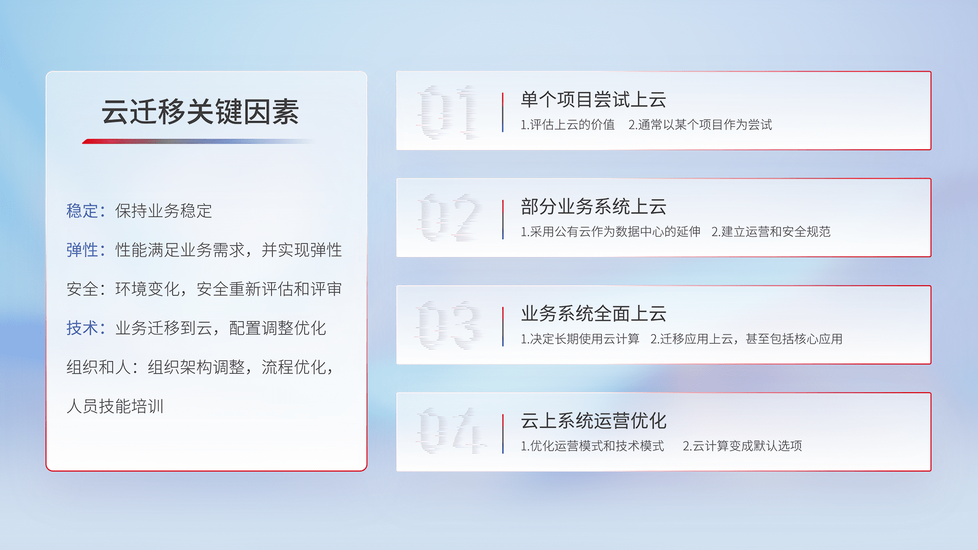 结合实际业务,,,,从规划设计、、云平台选型、、云原生改造、、、数据迁移、、集成交付,,迁移全过程为客户识别最佳上云路径,,,,做好风险识别管理,,设计网络架构、、、身份权限、、、安全审计合规、、操作审计、、、日志审计、、、、监控告警策略、、、、多站点容灾设计等,,对云上基础设施进行整体规划,,,提升IT治理水平,,,,以满足弹性、、、、高可用、、高性能的需求。。。