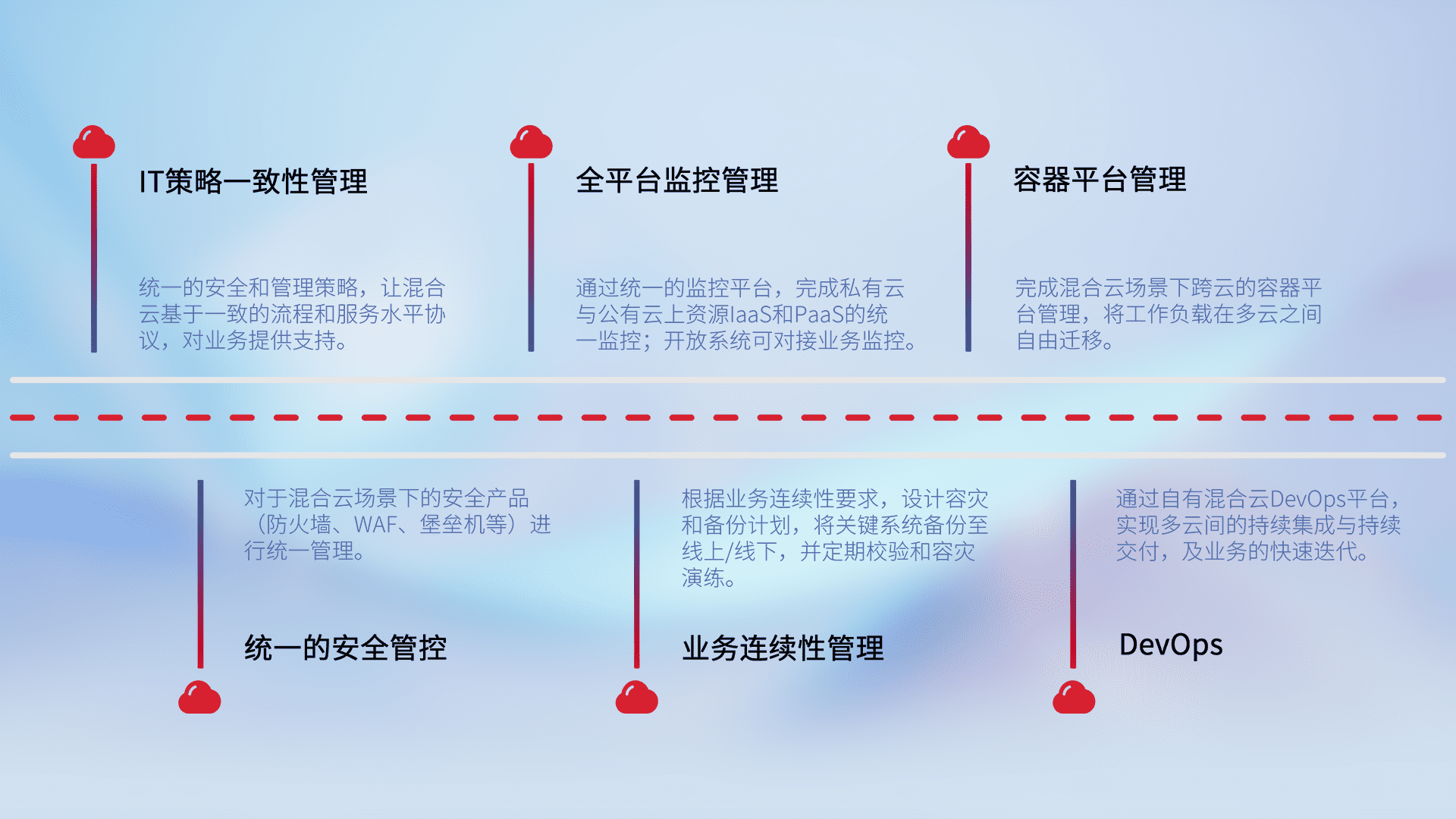 通过多云纳管,,,,以统一的资源数据模型把客户的云资源进行抽象和封装,,,进而实现对多云资源的统一操作,,保障云资源管理的可靠性、、、、稳定性与可用性。。。量身定制化运维内容,,,,配置、、开发运维、、补丁管理、、、、备份、、、监控、、认证和访问管理、、、审计和日常巡检等,,,保障在用云过程中的可靠度,,,稳定度以及高可用率。。