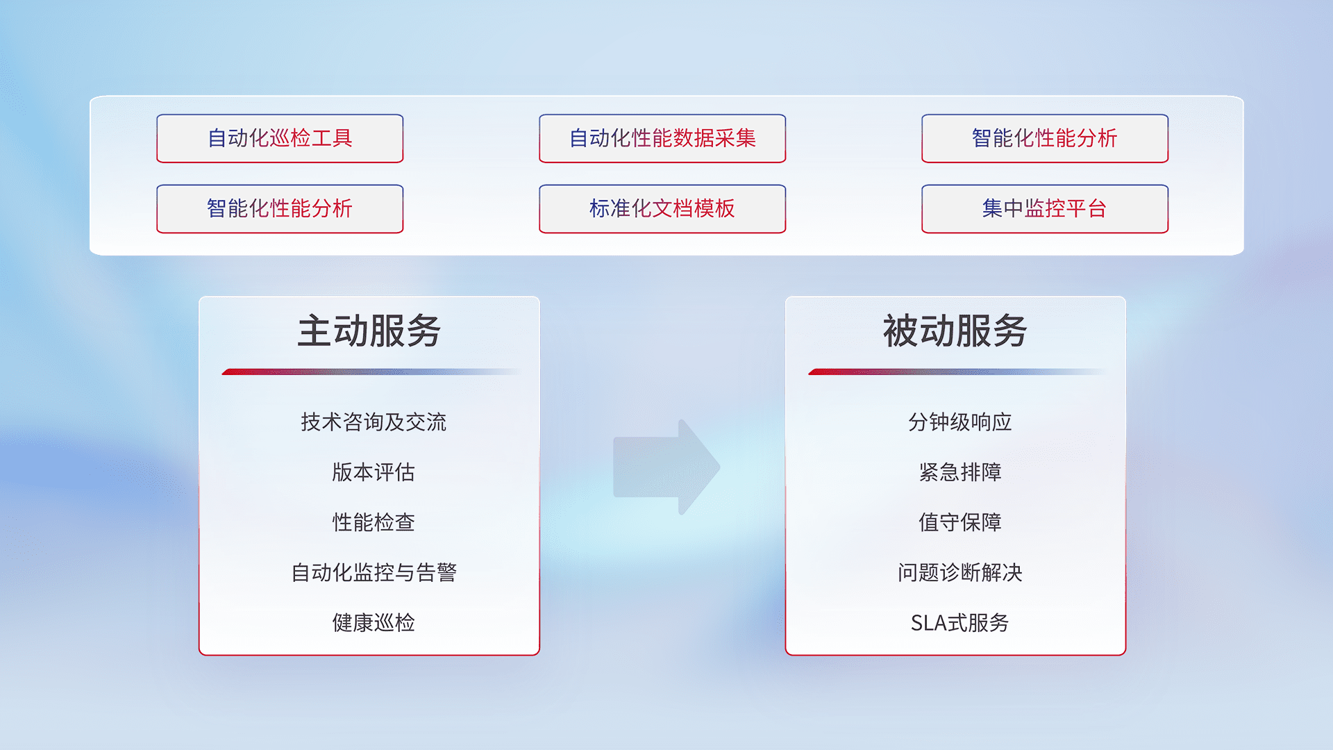 智能化工具和标准化文档,,,,保障服务质量,,提供主动服务(包含技术咨询、、版本评估、、、、性能检查、、、、自动化监控与告警、、健康巡检)和被动服务包含(分钟级响应、、紧急排障、、、值守保障、、、、问题诊断解决、、SLA服务)。。。